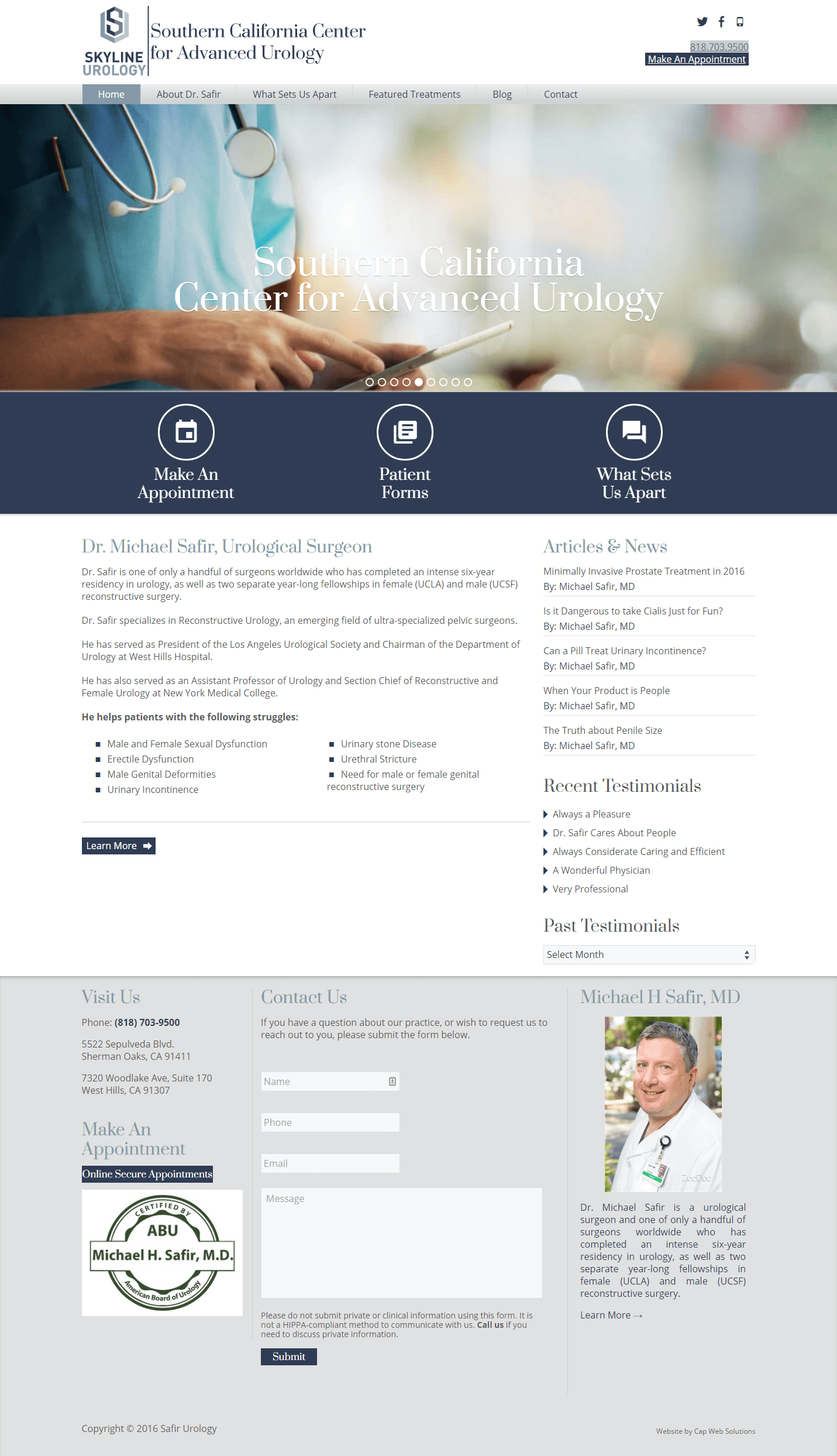 Dr. Michael H Safir is a renown urological surgeon practicing in southern California. Dr. Safir had a one-page definition website and was ready to move to a full featured, mobile ready, captivating online presence where he could highlight the services that he offers, offer a means for his patients to set appointments and ask general questions, and more importantly, develop a platform for writing about his profession.